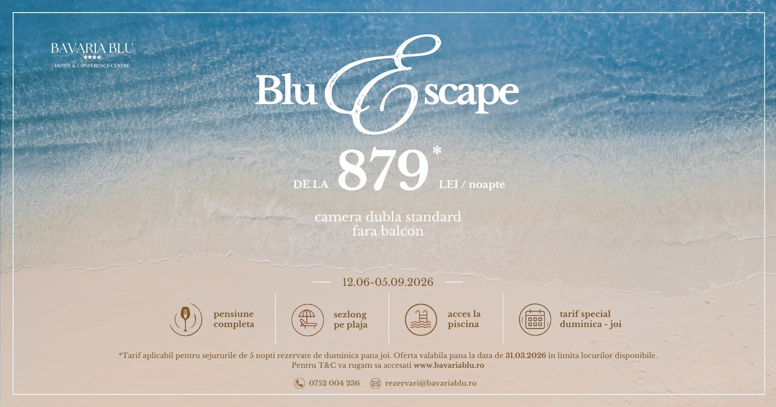 Bucură-te de un sejur relaxant la malul mării, cu pensiune completă, acces la piscină și șezlong pe plajă, de la doar 879 lei/noapte. Oferta este valabilă până la data de 31.03.2026.